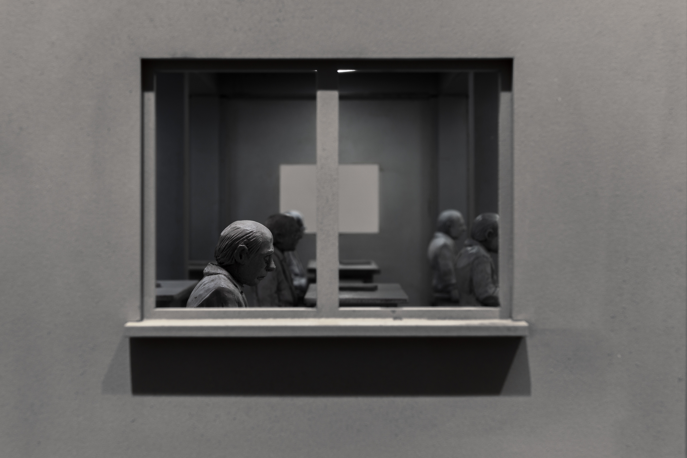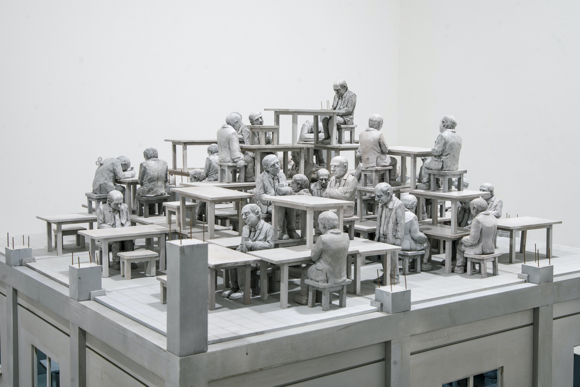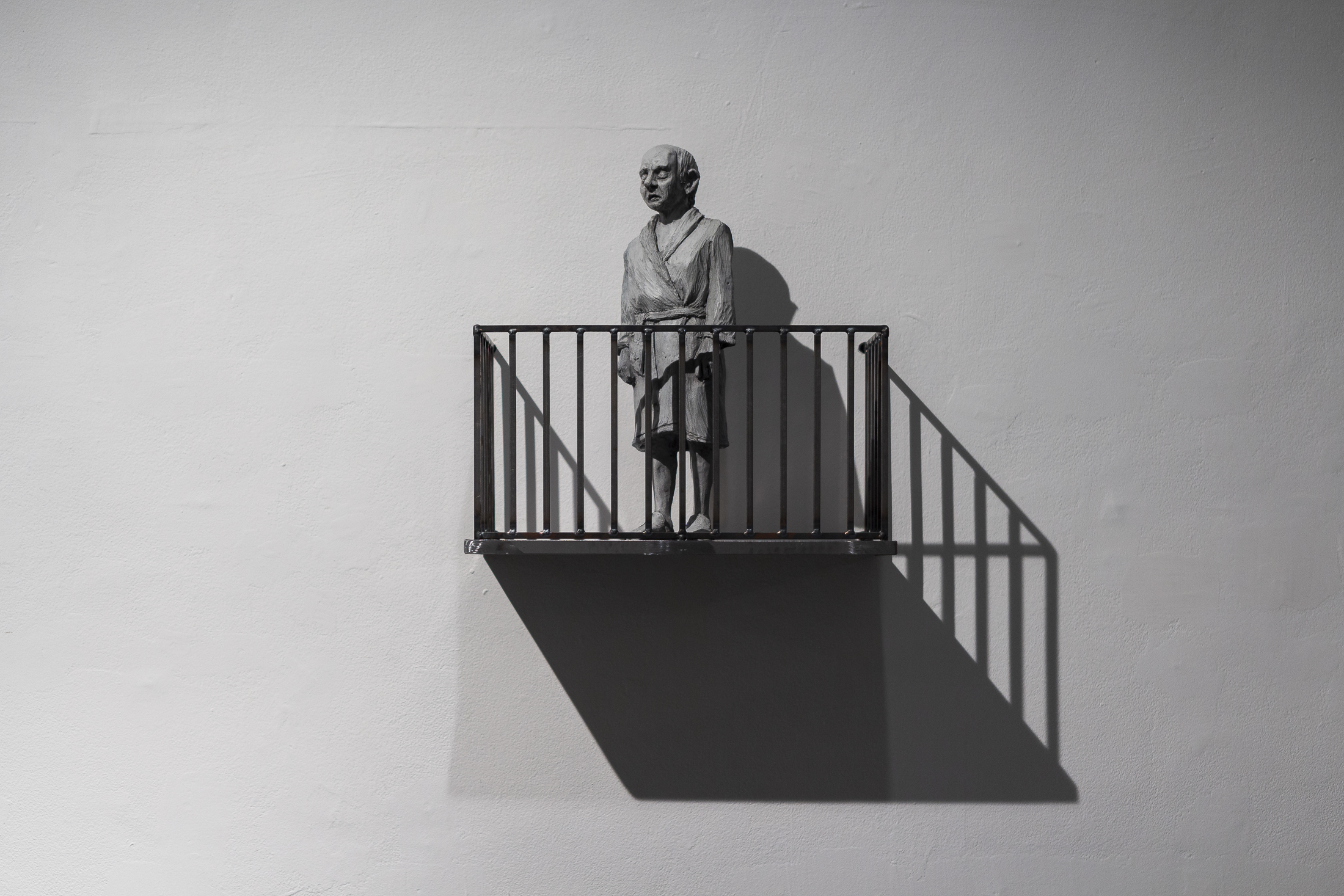 In most of Isaac Cordal’s works there is a “scene.” That is to say, a plot, an intrigue, something dramatic – drama, in Greek, means action. It is a moment in which a story is focused; where something is about to happen. Each scene is a moment of crisis and describes the imminence of a tragedy, a catastrophe, a denouement – a catharsis, perhaps. In short, in terms of playwriting, that which precedes a denouement. A critical moment. Well, in each scene, the event that is created in the narrative is a critical event. But what defines Isaac Cordal’s work is precisely that it presents us with the possibility of a drama without a real development of the event, that is to say: no definitive scene. The little man then appears “in suspense”, always attentive, in his balcony, his corner, his alcove or his watchtower, of what is “no longer” and, at the same time, of what is “not yet”. Deprived of his history (and of History: also devoid of a future), this ontological fragility has left him orphaned of any idea of happiness or progress. His mode of existence is none other than stupefaction, a term that comes from the same root as stupidity. It is that of the individual who sees everything, but can no longer do anything. He looks around him, and manages to see only the flaw, the flaw that is now a part of him. He is in fact the last man, a posthumous man, Nietzsche would tell us. And therefore, perhaps unintentionally and unknowingly, in an unprecedented manner too, he’s been kept in his mythical suspension for the time being, or perhaps forever?