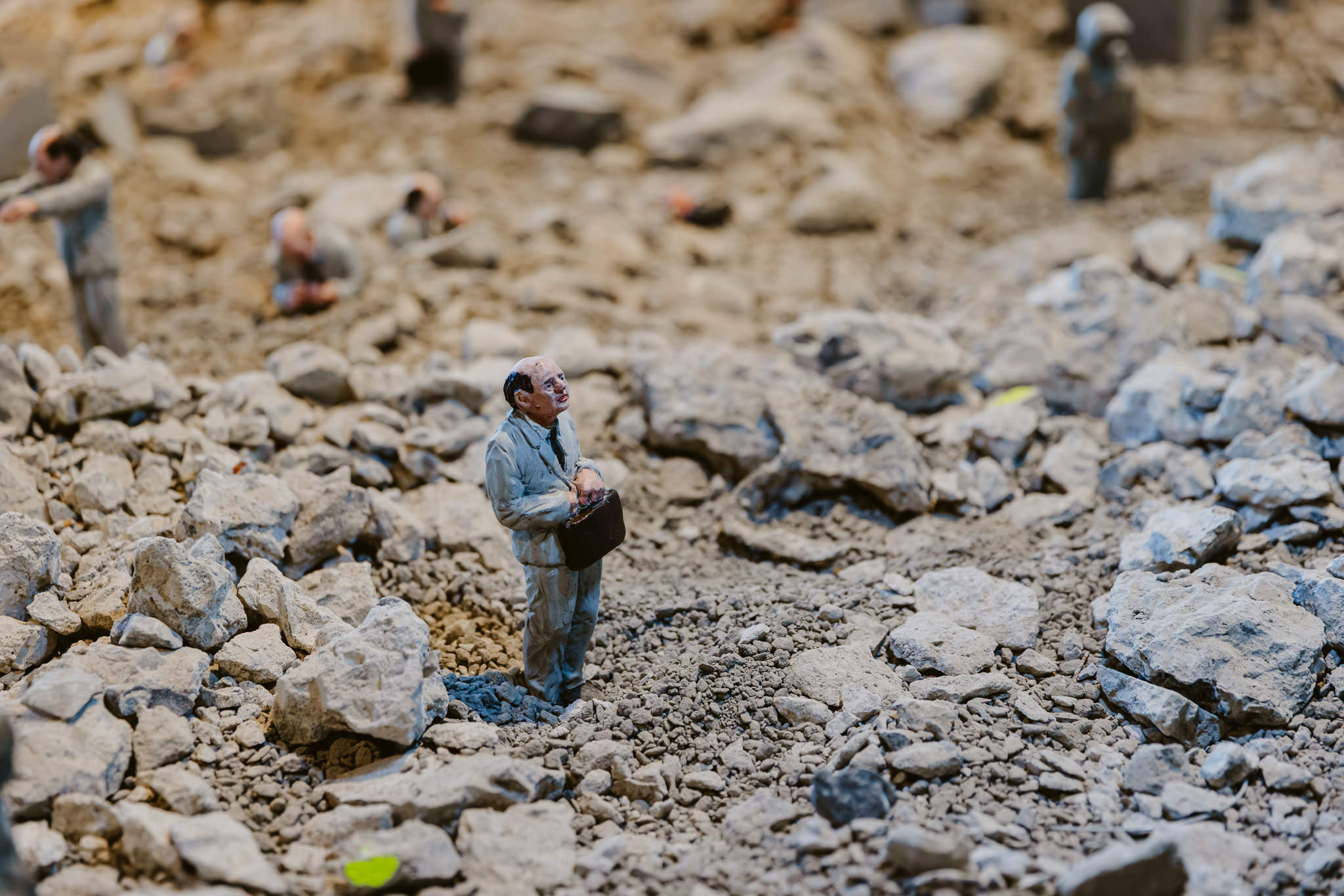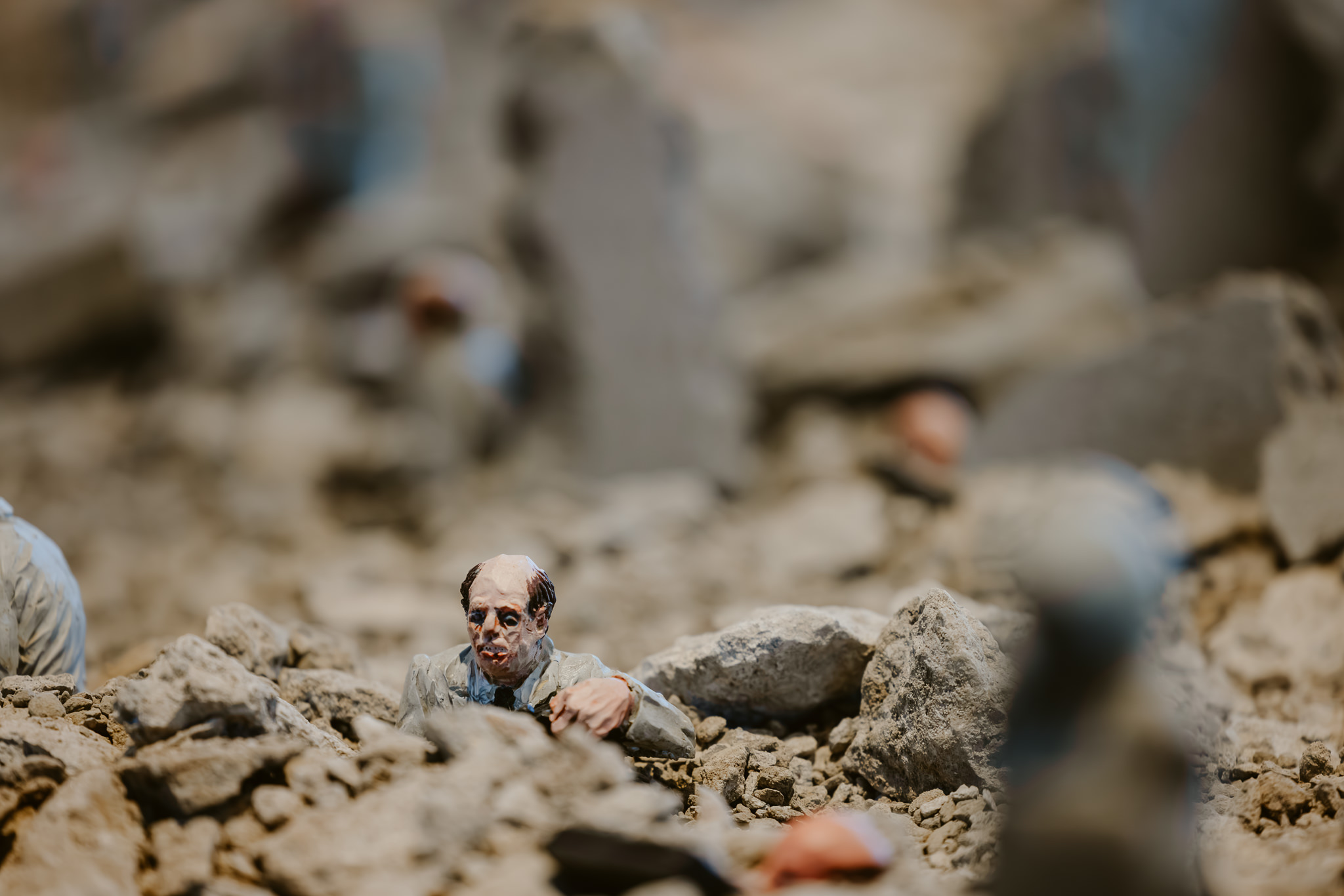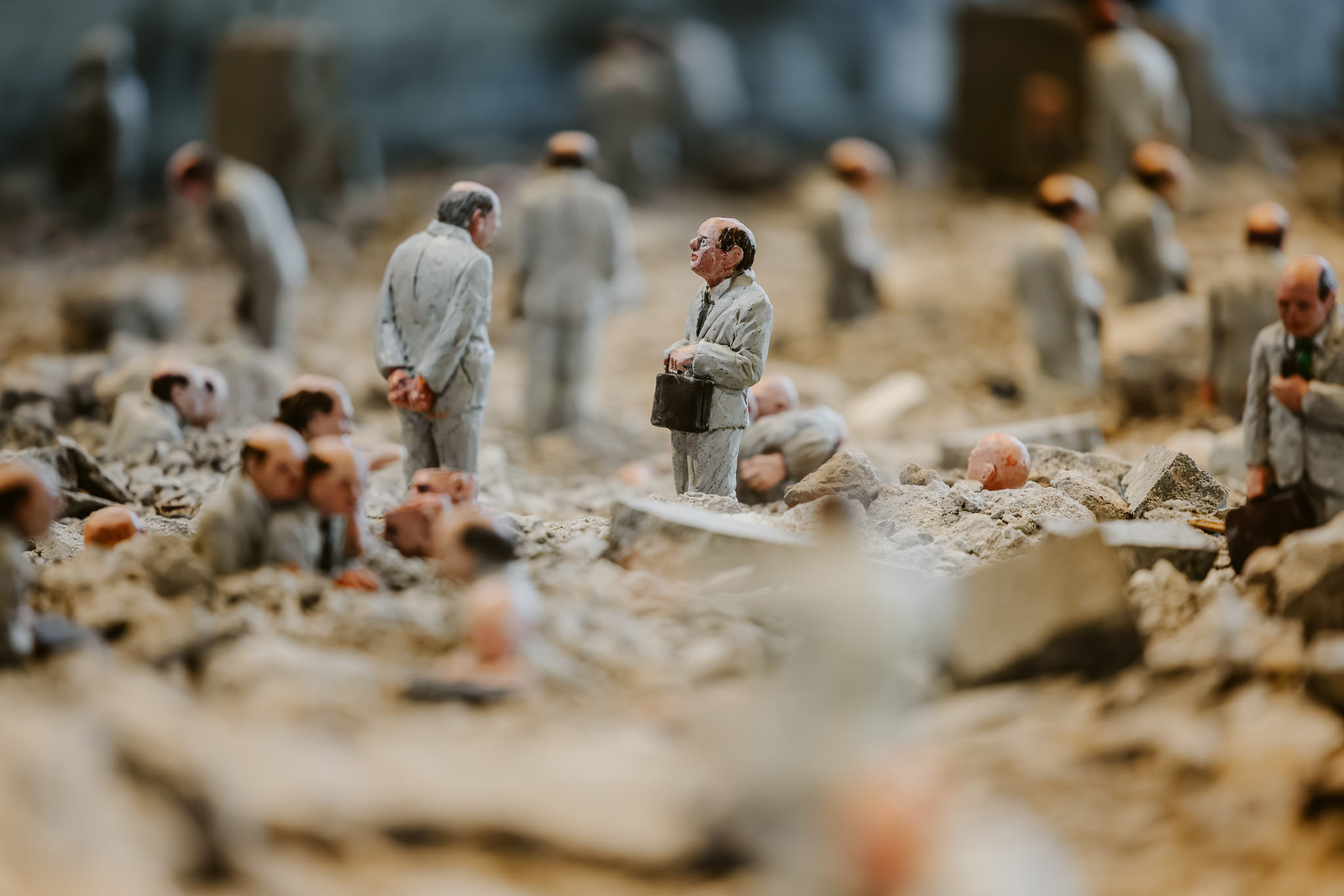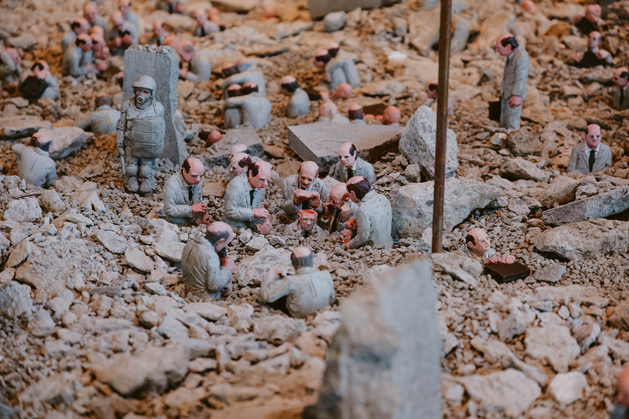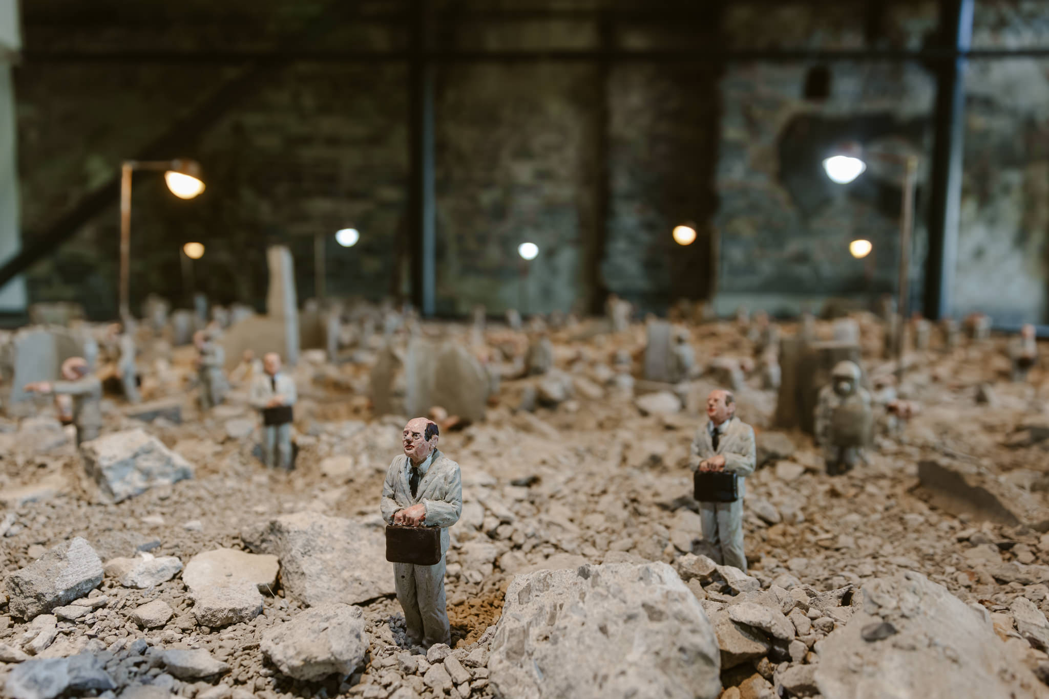 Isaac Cordal’s installation Follow the Leaders is a powerful commentary on the current state of western societies, as we face the ravages of unchecked capitalism and looming threat of environmental catastrophe. In a mise-en-scène on the gallery floor, miniature effigies of men in suits and ties grapple with some kind of disaster. These powerless, impassive figures sink into the rubble of urban disintegration, gradually engulfed by a ruined landscape.